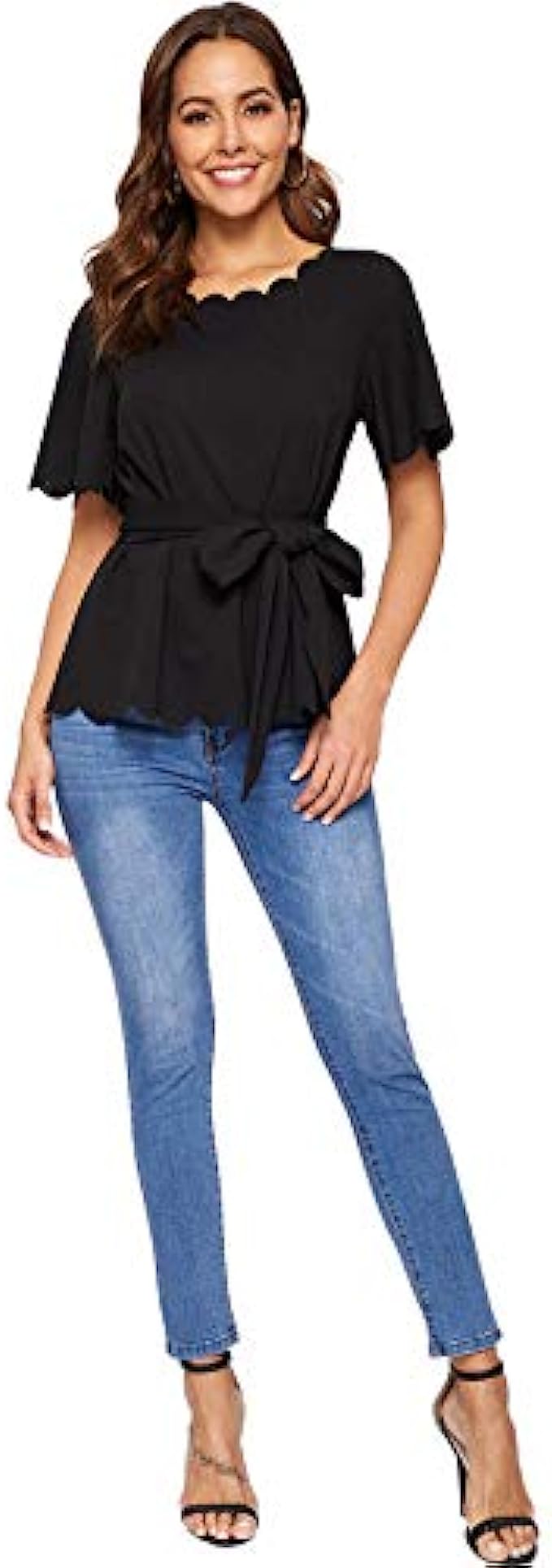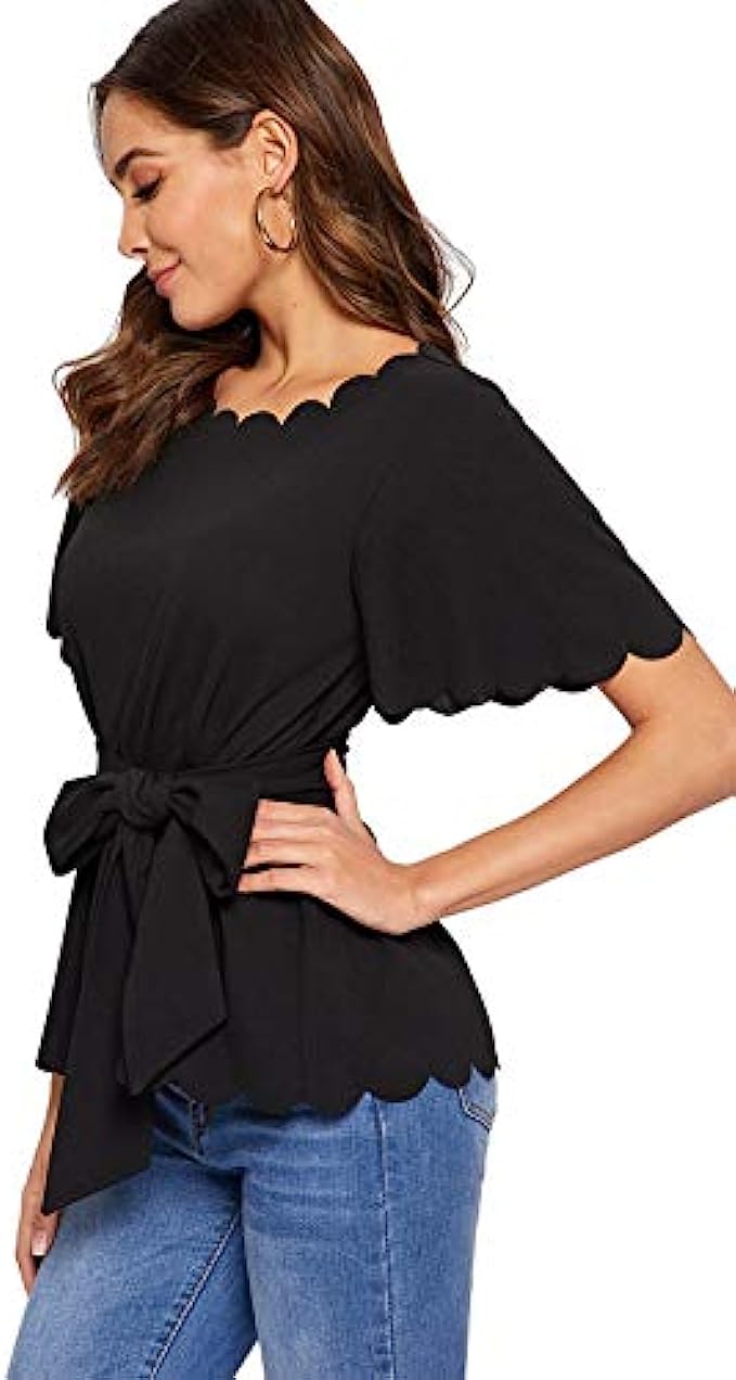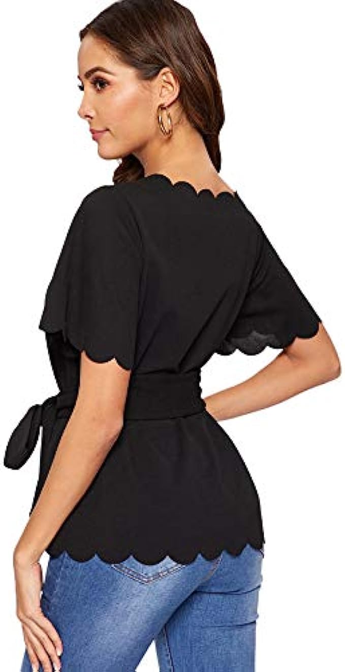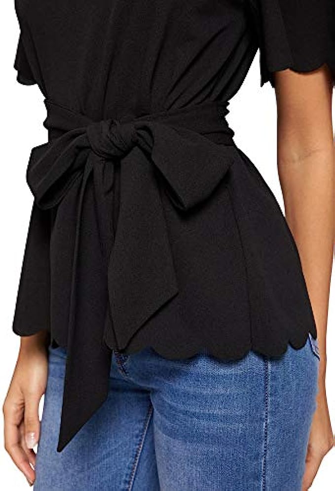 Romwe Women’s Bow Self Tie Scalloped Cut Out Short Sleeve Elegant Office Work Tunic Blouse Top